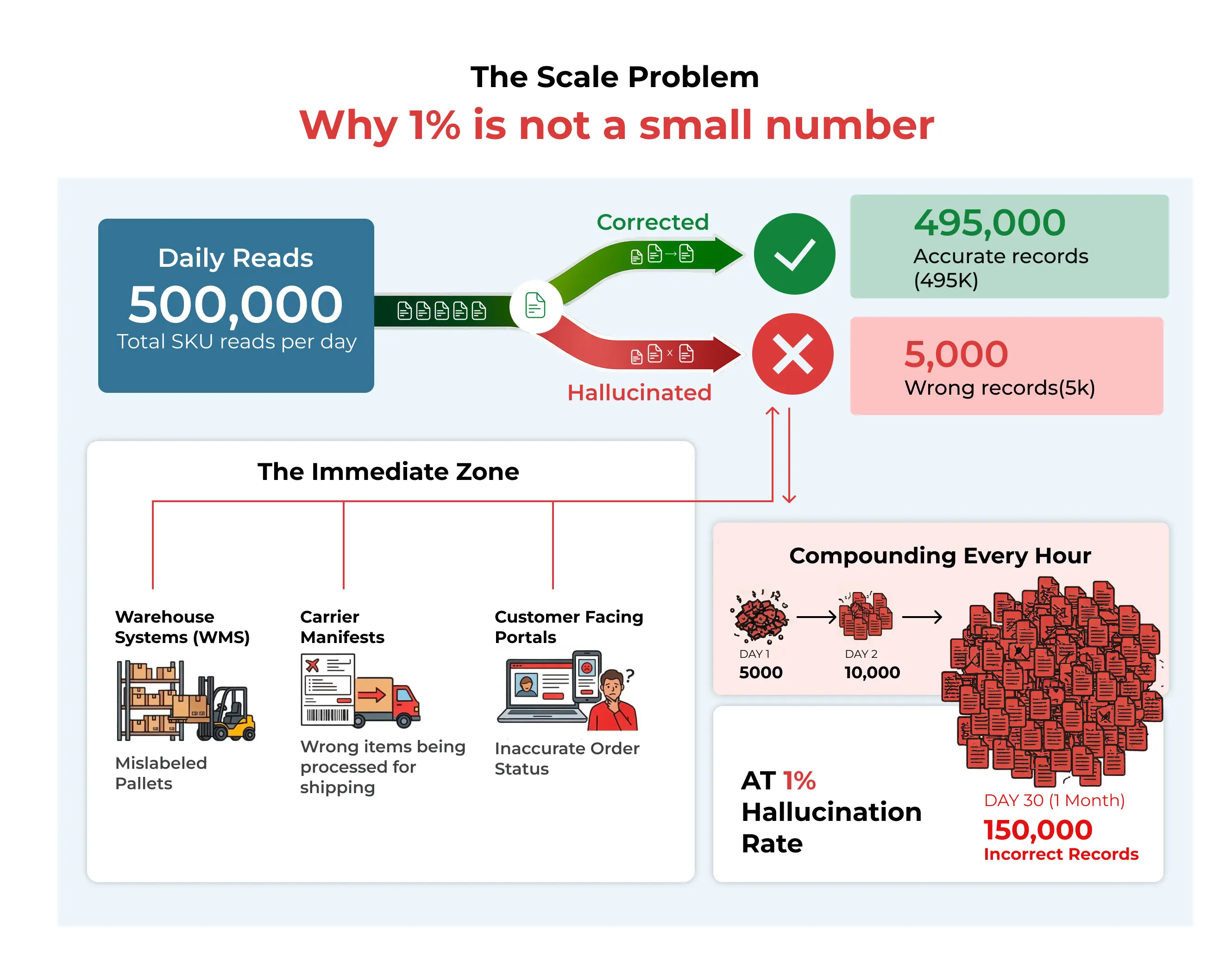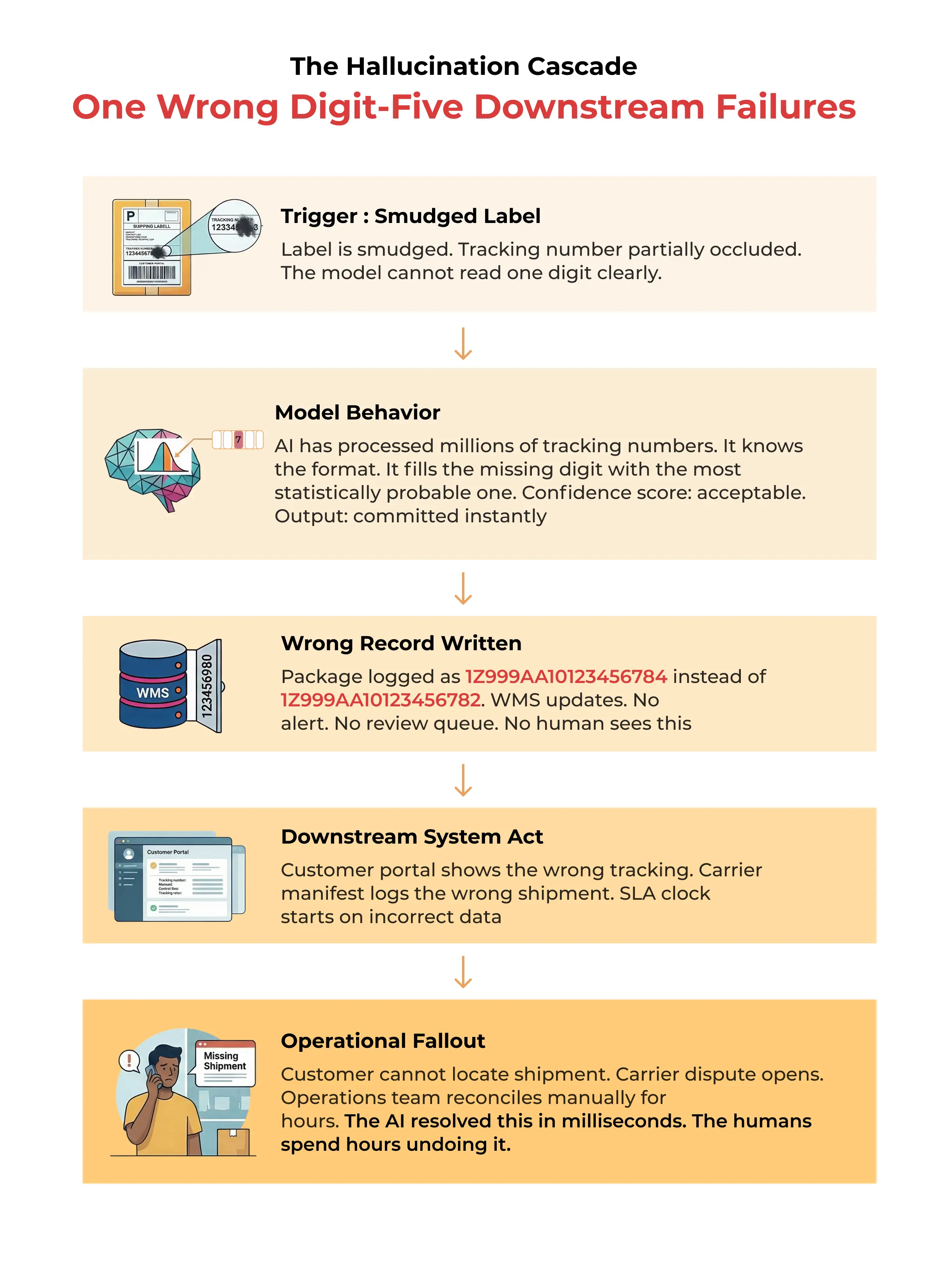 A fulfillment center processing five thousand orders a day is not asking AI to be creative. It is asking AI to be right. Every time. Without exception. And when it is not right, the error does not sit in a draft folder waiting for review. It moves downstream at operational speed, directly into inventory records, carrier manifests, customer commitments, and compliance documents.