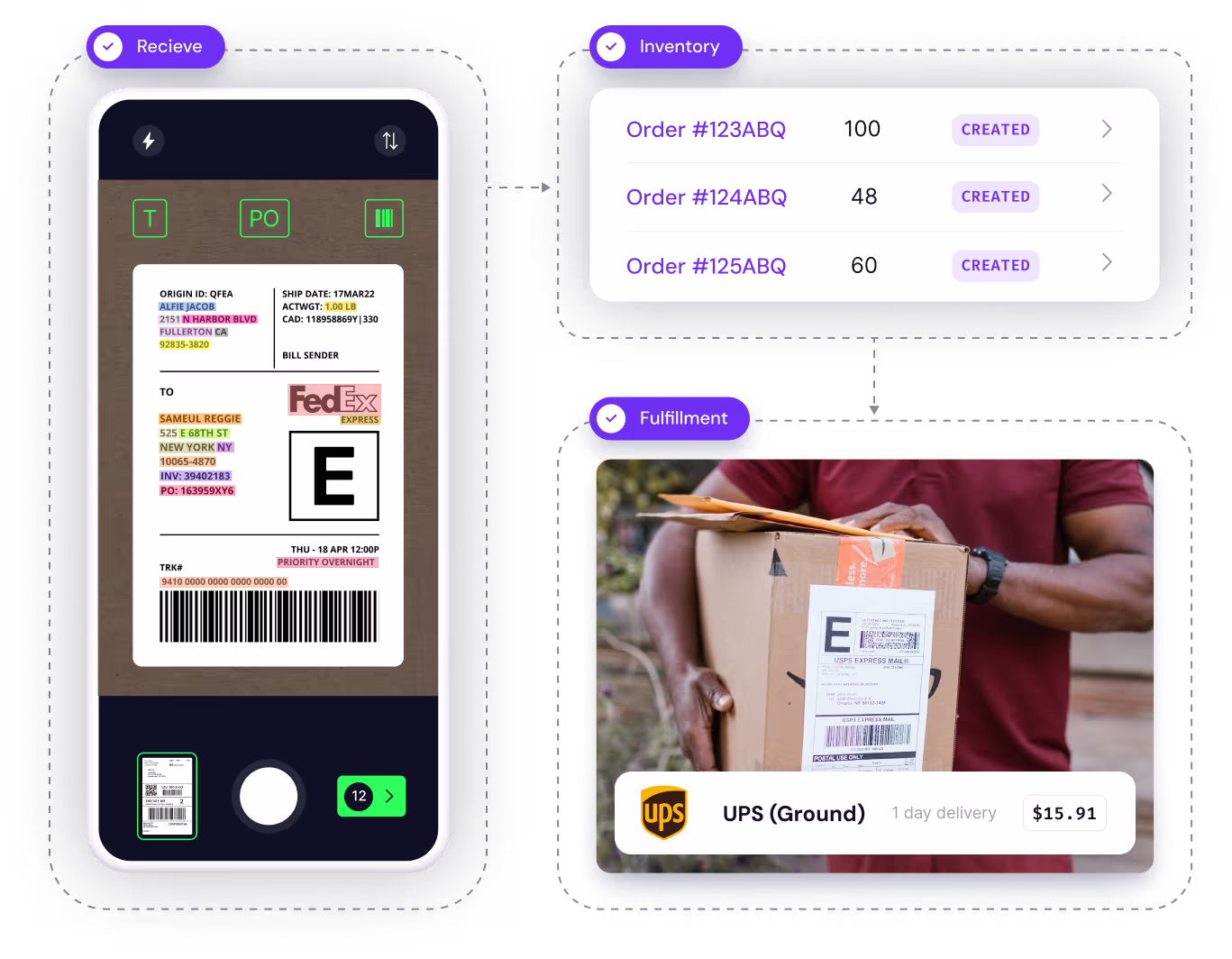 Tracking all product information throughout the receiving process is essential. Using smartphones powered by OCR, QR code, barcode, and RFID technologies, businesses can extract detailed information such as SKU numbers, serial numbers, expiration dates, lot codes, and more. Comprehensive product tracking also helps with returns and reverse logistics operations as well.